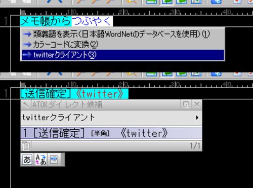 twitterでいろいろ作業ログを残そうと思うんだが、専用クライアントを使うんではどうしても一手間余分に掛かってたぶんそのうち飽きる。 これもATOKでやれればメモ帳でもブラウザの検索バーでもテキストを打てるところがあればPOSTできるよなーということで…